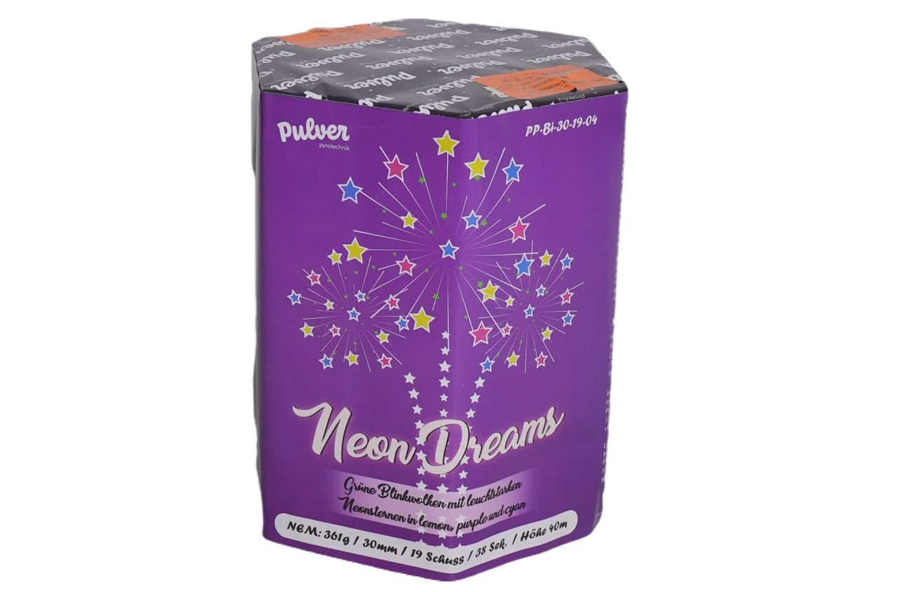 19 Schuss I-Shape-Batterie im Kaliber 30mm. Grüne Blinkwolken mit leuchtstarken Neonsterne in Lemon, Purpel und Cyan.